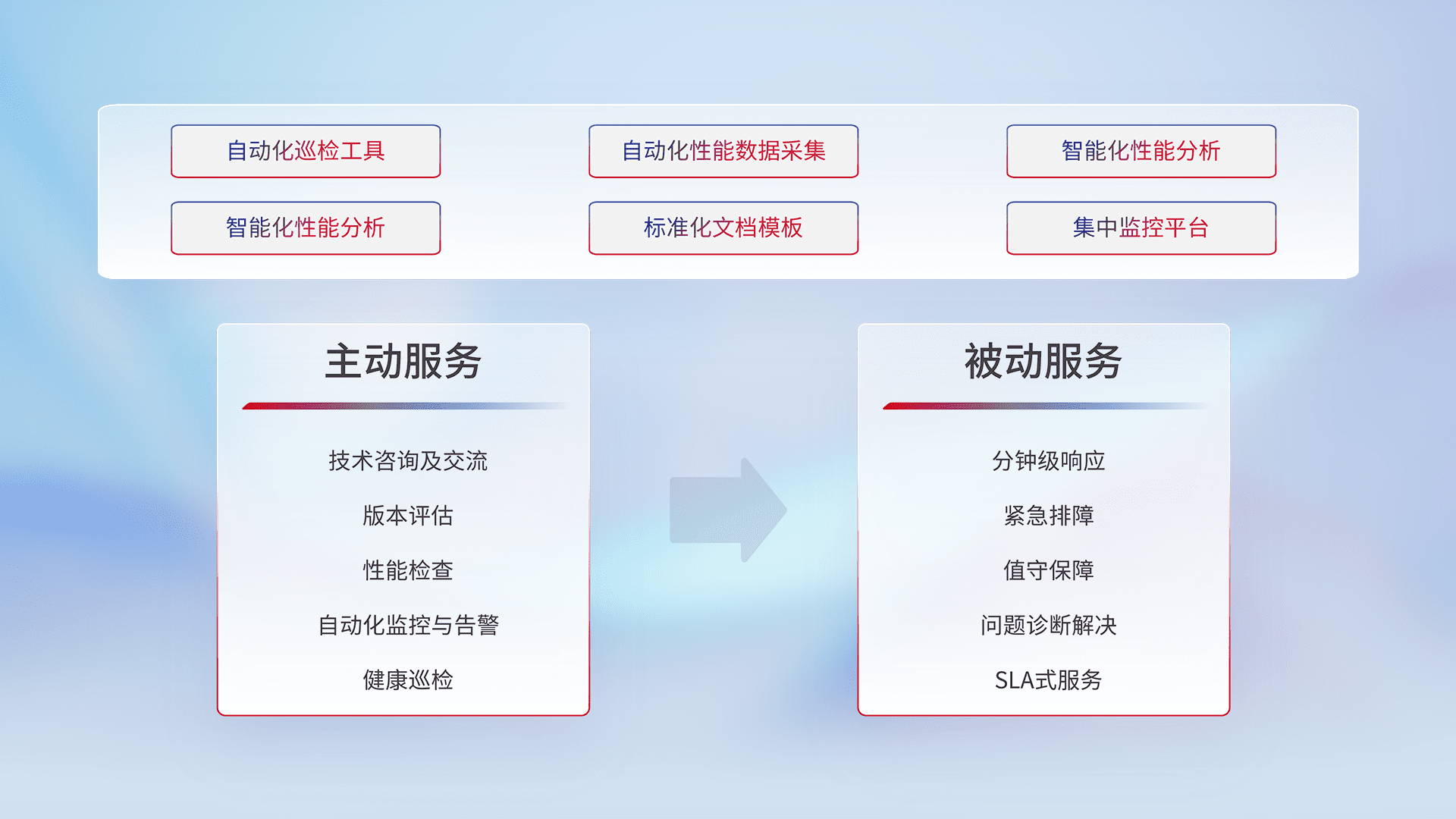 智能化工具和标准化文档,,,保障服务质量,,,,提供主动服务(包含技术咨询、、、、版本评估、、、、性能检查、、、自动化监控与告警、、健康巡检)和被动服务包含(分钟级响应、、紧急排障、、、值守保障、、、、问题诊断解决、、、、SLA服务)。。。